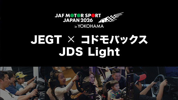 モータースポーツジャパン2026 in 横浜のAUTOBACSブース「コドモバックス」に、JEGTとして出展します。 子どもたちを対象としつつ、大人の方も楽しめるeモータースポーツの体験会及びJDS Lightを実施。 ぜひご家族でお越しください。